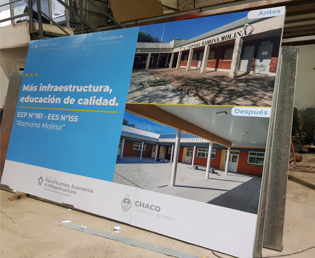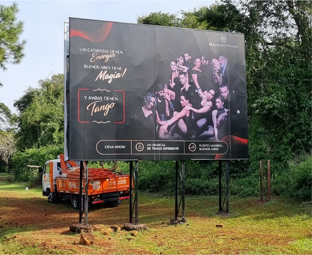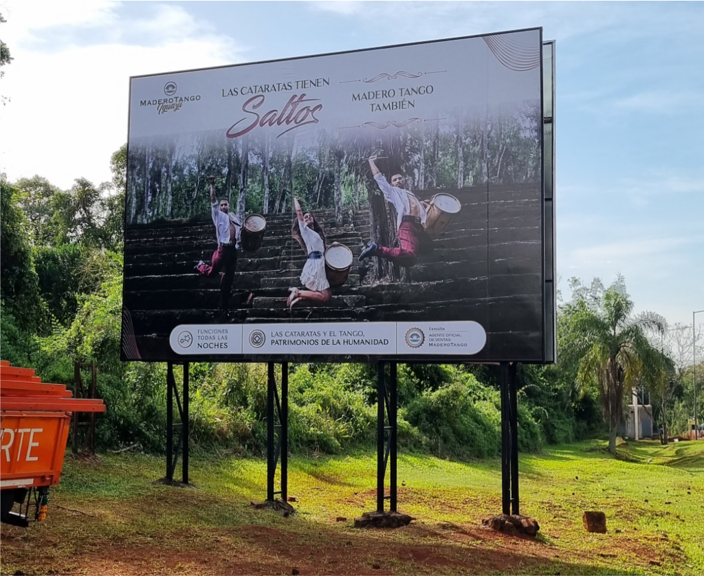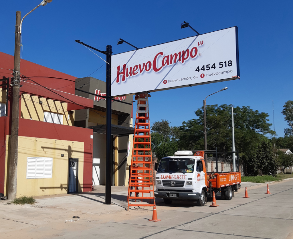 Chasis de Caño estructural con Lona Frontlight que puede ser Impresa UV, Impresa Latex ó Ploteada con vinilos de 5 años de duración. Iluminacion con Reflectores